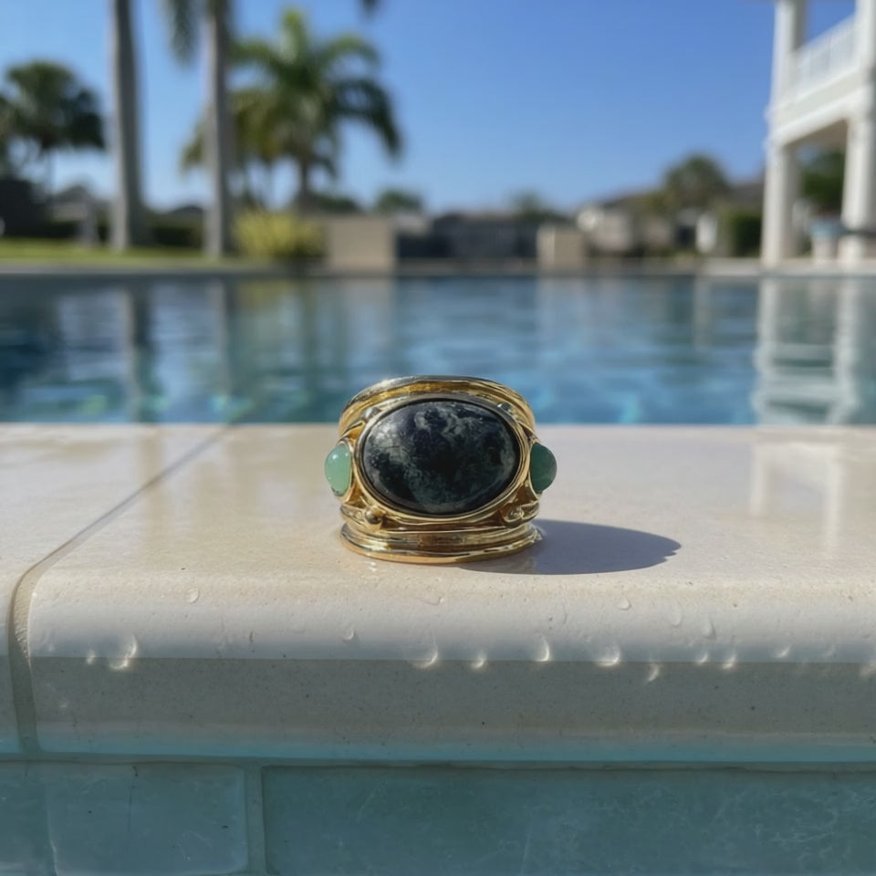 Bague Simone dorée à l'or fin, sertie de trois pierres fines taillées à la main, d'un grand cabochon de Jaspe Kambaba sur le devant et deux petits cabochons de Amazonite sur les côtés symbolisent la stabilité et encouragent l'expression de soi.