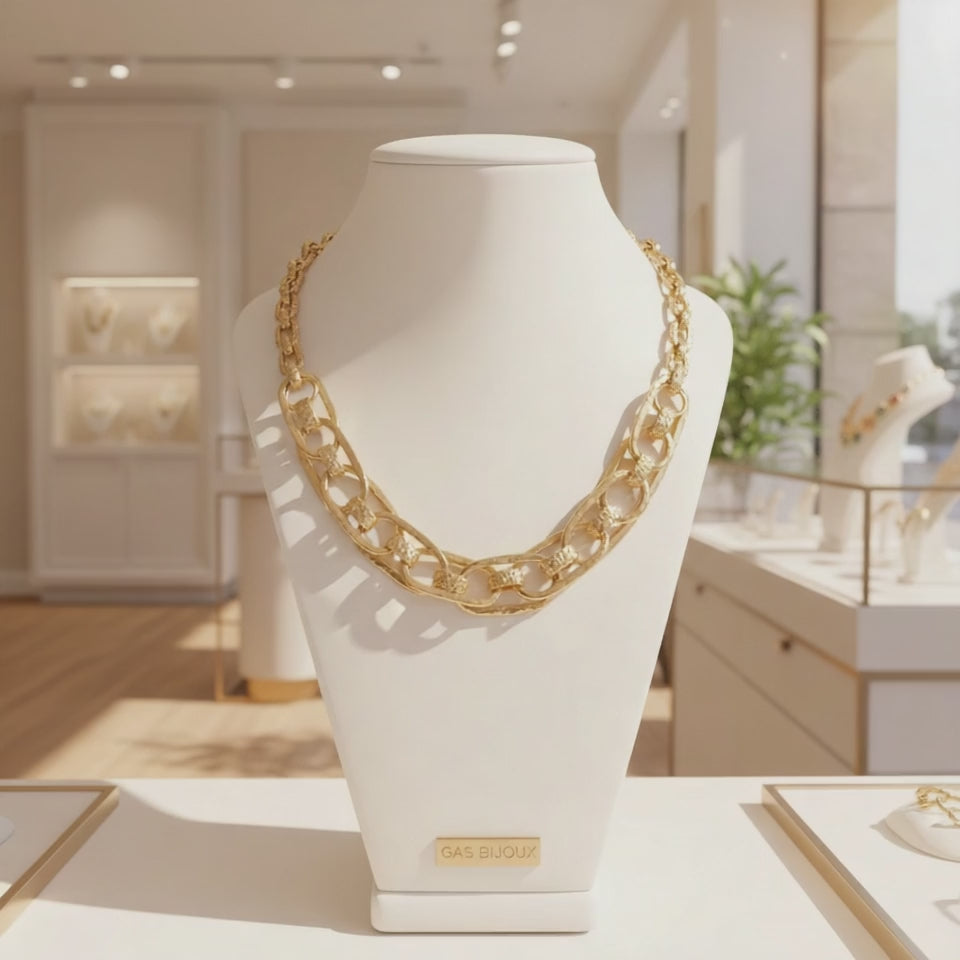 Collier doré d'exception, façonné par les mains expertes des artisans de Gas Bijoux à Marseille. Son architecture repose sur des maillons ovales massifs, martelés individuellement, qui s'entrelacent en un motif central captivant. Chaque coup de marteau confère au métal une texture authentique et une profondeur visuelle remarquable. Composé d'étain revêtu d'une fine couche d'or ce collier conjugue légèreté et présence. Son fermoir à anneau assure une fermeture sécurisée et discrète. Une pièce de joaillerie qui incarne le design sculptural et le savoir-faire artisanal français.
